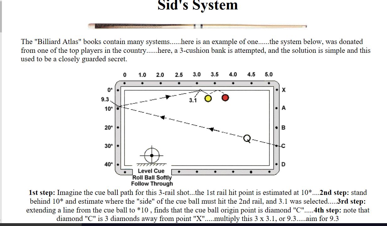 « Diamond System » - THE Universal System Execution characteristics Height on ... As a matter of fact, this system is considered to be the universal method for carom billiard. It's a common fact that in a game of Carom Billiard more than 1/3 of the points will be made with the help of this technique. ... In the diagram below, Start is at 30 ...