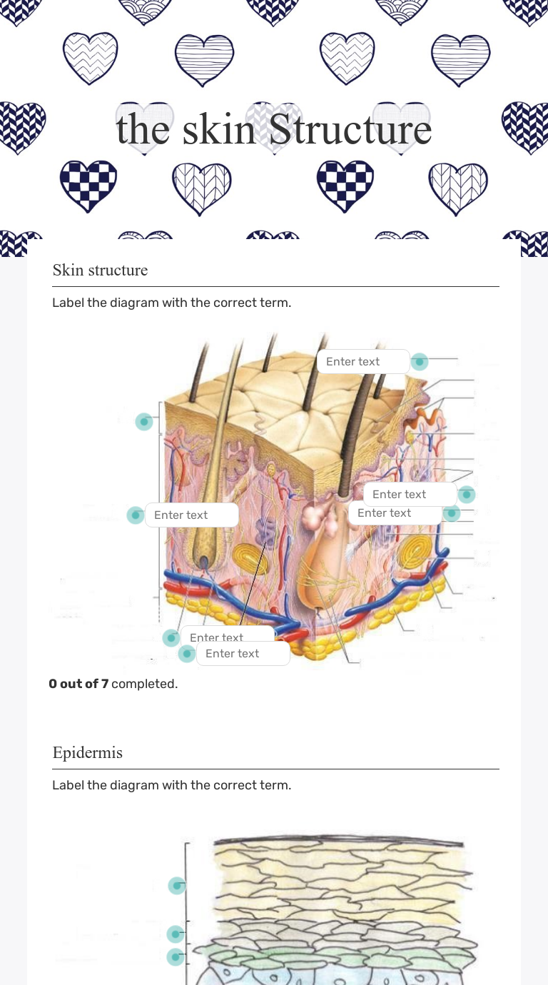 Label the skin anatomy diagram answers. Label the Skin Anatomy Diagram Name_________________ Use the word bank below to ... Pacinian corpuscle - nerve receptors that dermis - the layer of the skin ... by S Lawton · 2019 · Cited by 18 — The skin and its appendages (nails, hair and certain glands) form the largest organ in the human body, with a surface area of 2m2 (Hughes, ... Label the skin structures and areas indicated in the accompanying diagram of skin. ... Answer each by placing your response in the appropriately.4 pages 13 Aug 2020 — The outermost layer of the skin is: the epidermis. 2. Which is the thickest layer: the dermis. 3. Add labels to the diagram of the skin ...