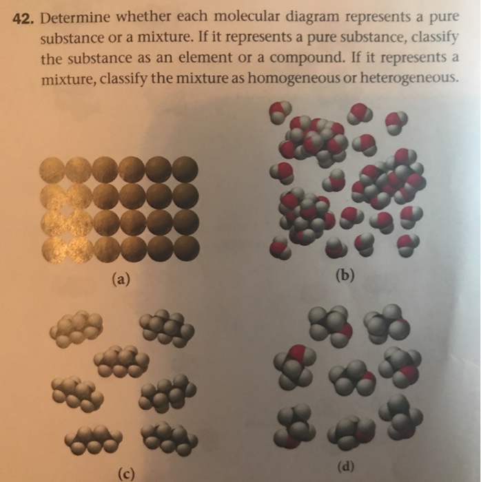 Transcribed Image Text. molecular diagram represents a pure substance or a mixture. If it represents a pure substance, classify the substance as an element or a compound. If it represents a mixture, classify the mixture as homogeneous or heterogeneous. Determine whether.
